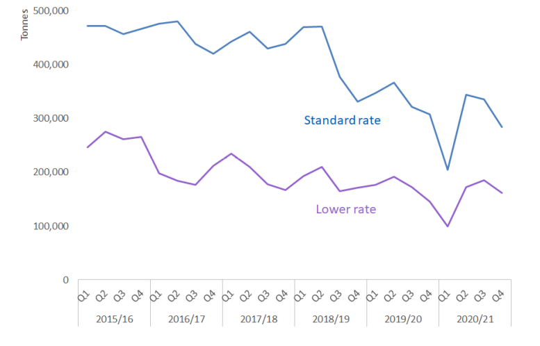 Standard rate disposals of 1.17 million tonnes were declared in 2020/21, a decrease of 13 per cent on the previous year, and a continuation of the long-term trend of gradually declining disposals.