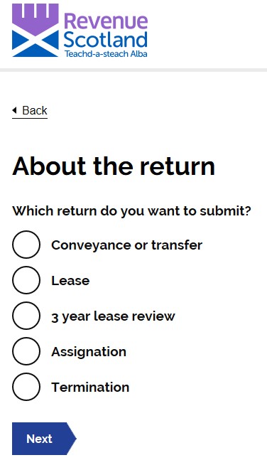 After selecting ‘Create LBTT return’ on the dashboard, you will be asked to select from five options. For a Conveyance or transfer return select ‘Conveyance or transfer’.